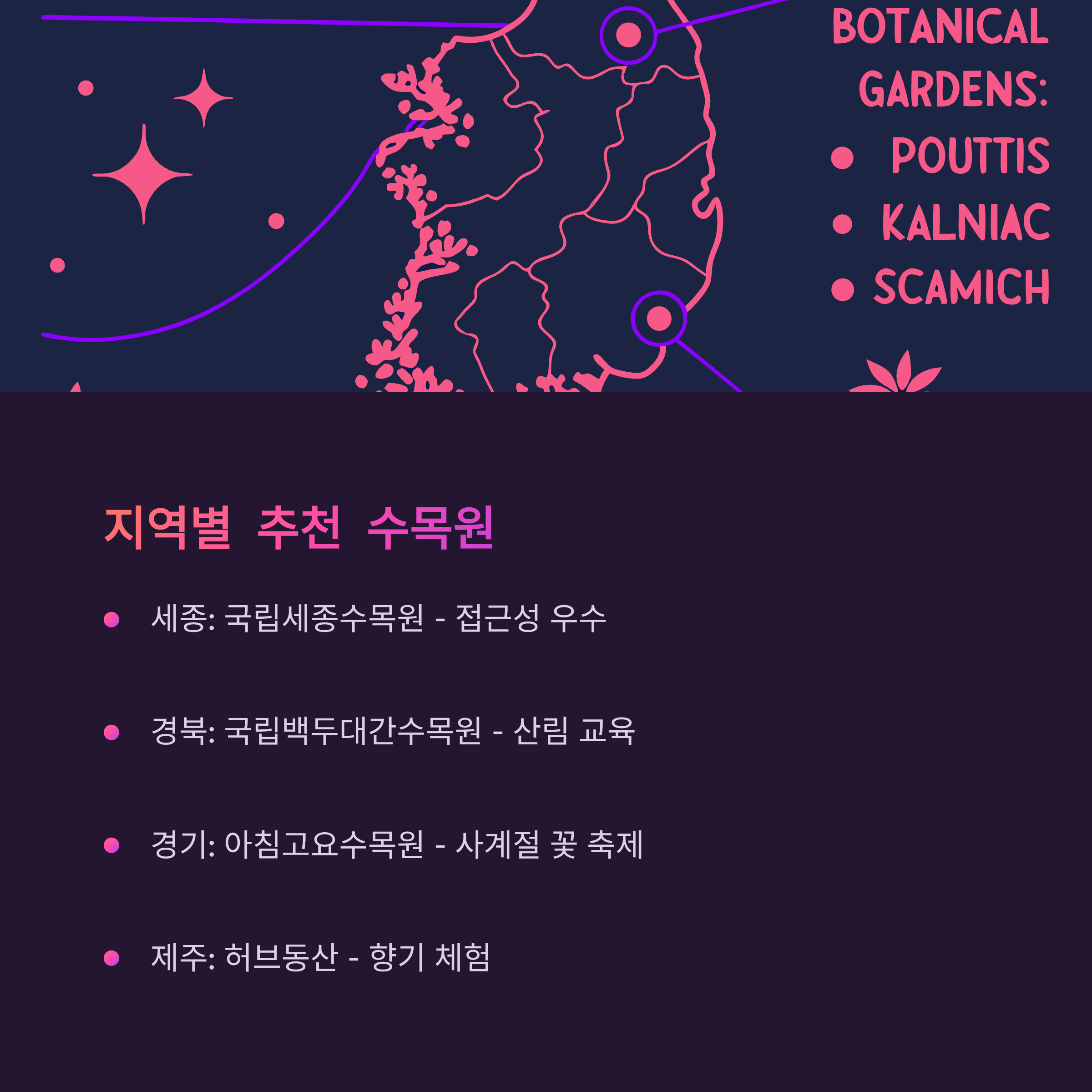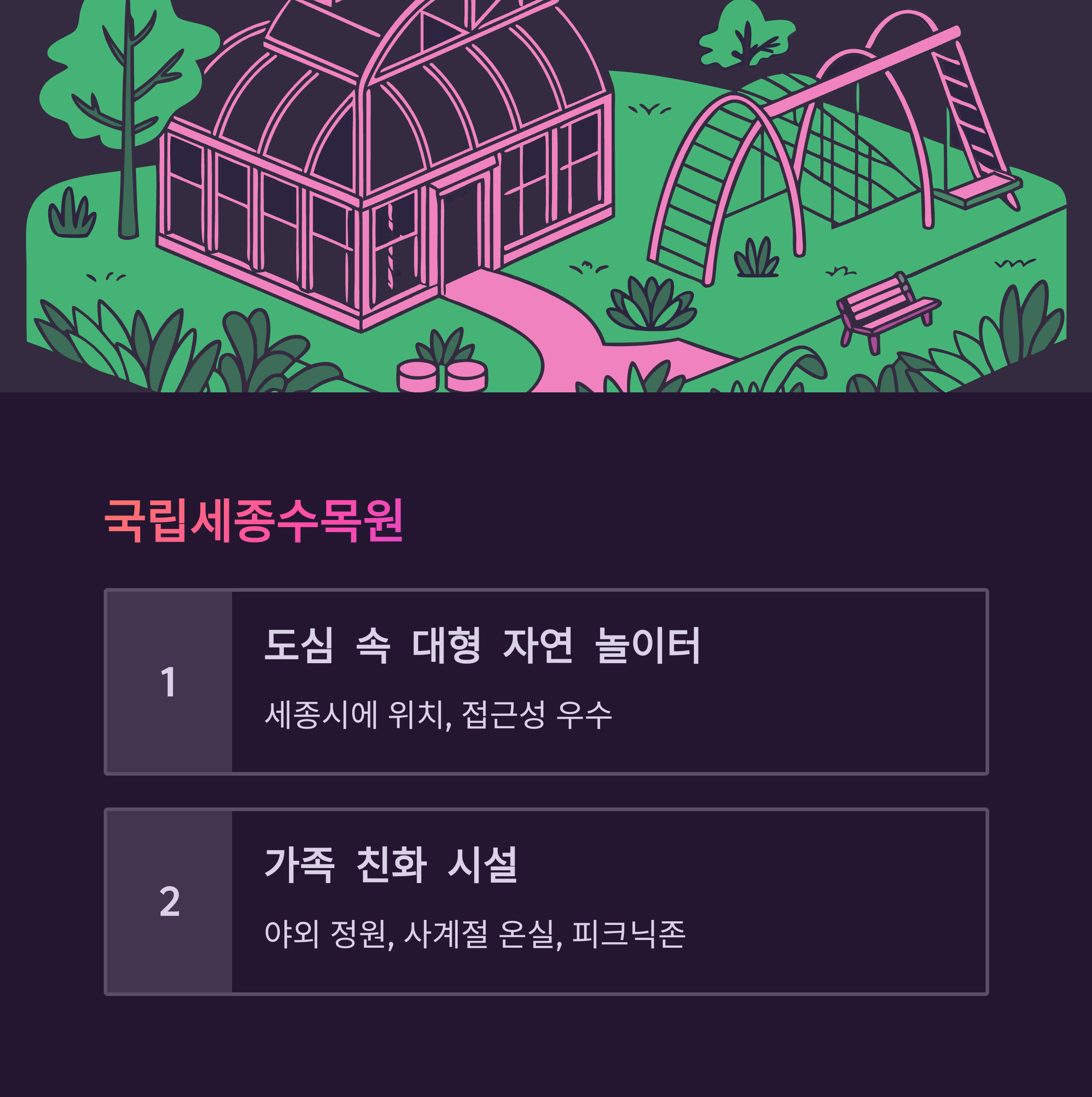 | 세종 | 국립세종수목원 | 접근성 우수, 체험 프로그램 풍부 |