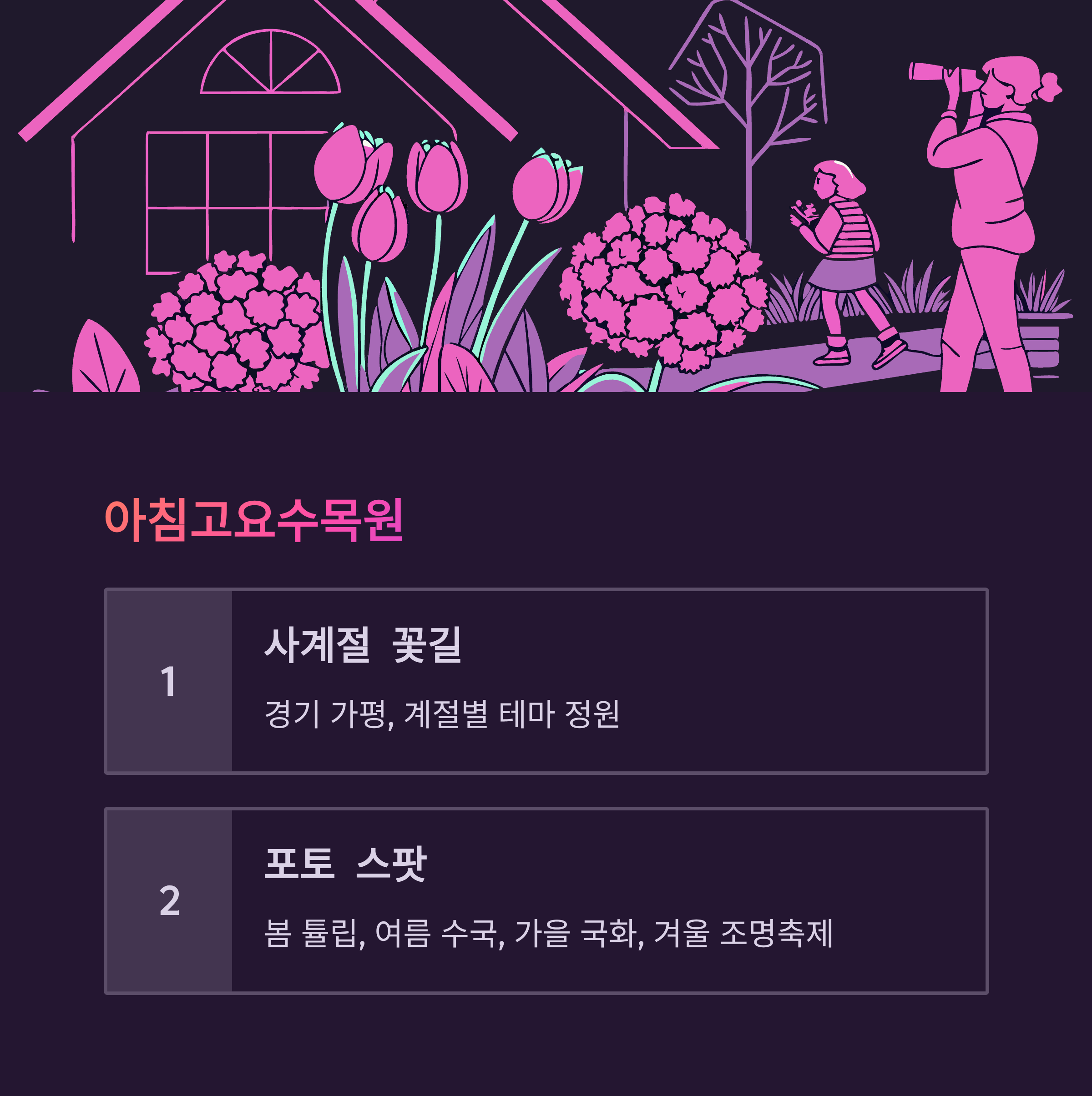 | 경기 | 아침고요수목원 | 사계절 꽃 축제, 가족 단위 사진 명소 |