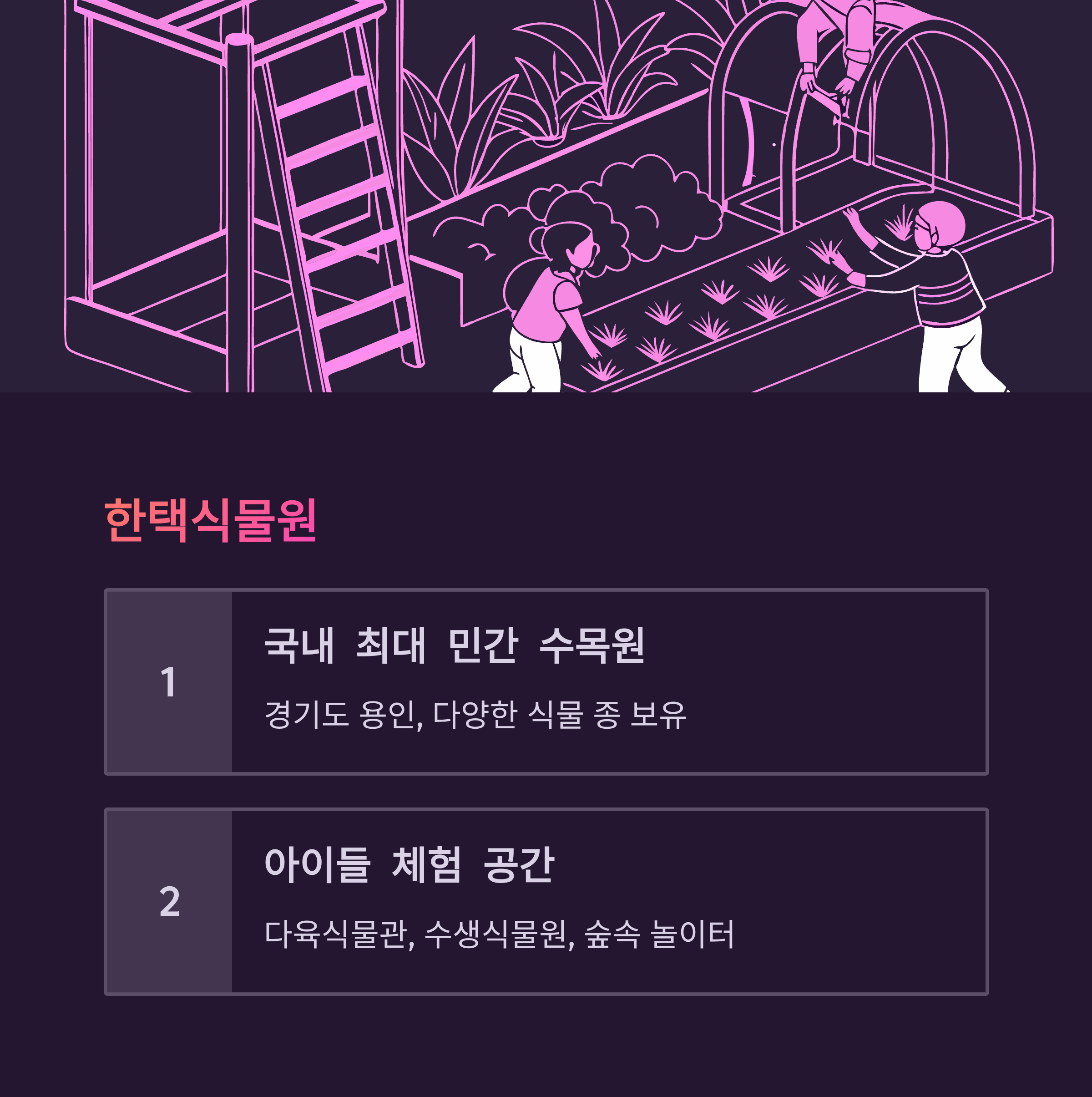 | 경기 | 한택식물원 | 국내 최대 민간 수목원, 체험 콘텐츠 풍부 |